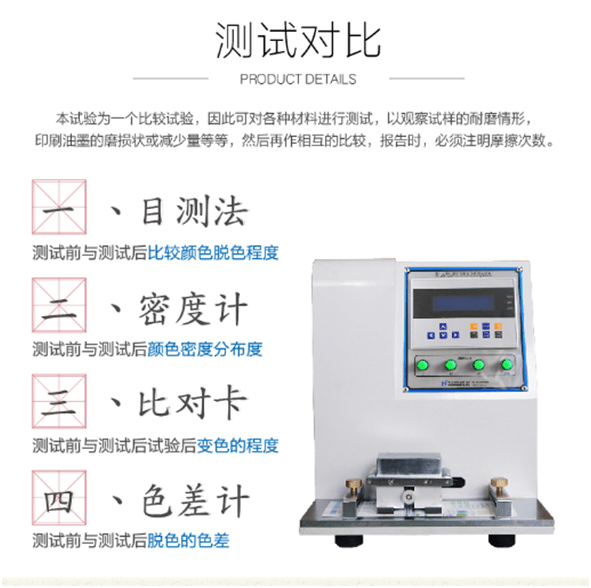 HD-A508印刷油墨脫色耐磨試驗儀適用于印刷品印刷墨層耐磨性將干或濕的標準摩擦紙包于摩擦頭,以規定壓力、往復摩擦行程及速度進行摩擦試樣表面,觀察試樣墨層脫落情況,確認試樣及標準摩擦紙污染痕跡或試樣表面出現起毛或磨損。