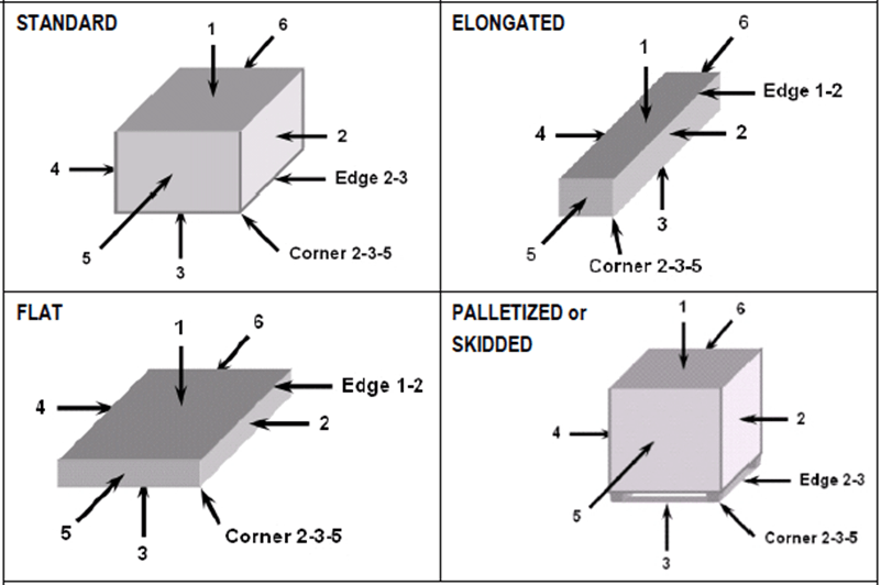 在進行測試之前,包裝件都要以最穩定的方向放置,使包裝件的一個最小面,面向試驗員,該面為5面。若包裝的一端明顯比另一端重,則最重的小面面向試驗員。如下圖這樣對樣品包裝件方向進行標示: