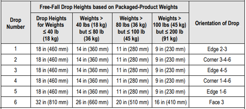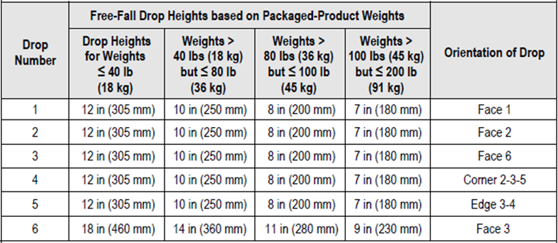 自由跌落的高度根據包裝件重量來確定跌落高度,標準件參考數據如下表: